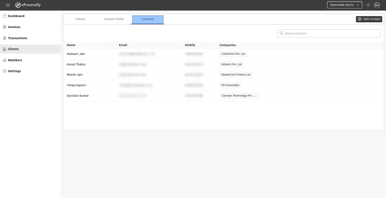 **Step 2:**                                                                                                                                                                                            To access the contacts list of the client, navigate to the "contacts" tab within the client's section.